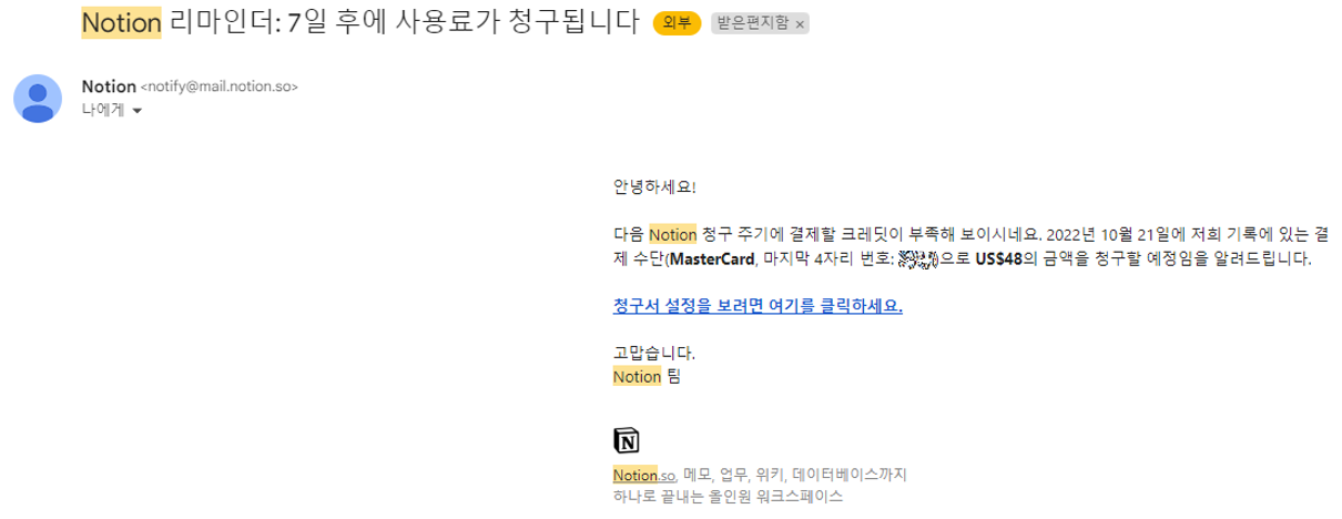 Notion은 친절하게도 사용료 청구에 대한 안내도 미리 합니다. 그런데 제가 메일 확인을 하지 않고 있었지요.