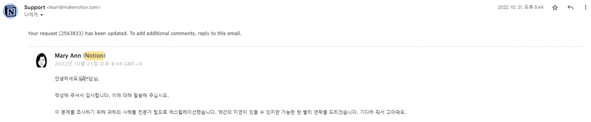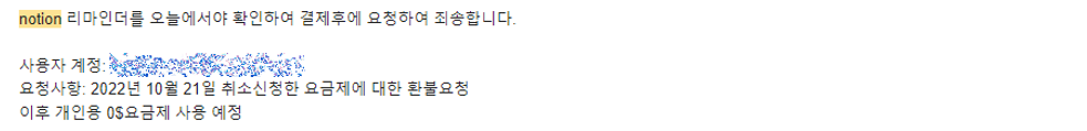 생각보다 빠른 대응에 감사하고, 사실 노션에서 결제한다고 사전에 예고도 했으나 신경 쓰지 않았던 제 잘못도 있는데 그럼에도 불구하고 이렇게 깔끔하게 취소해주니 너무 고맙더라고요.