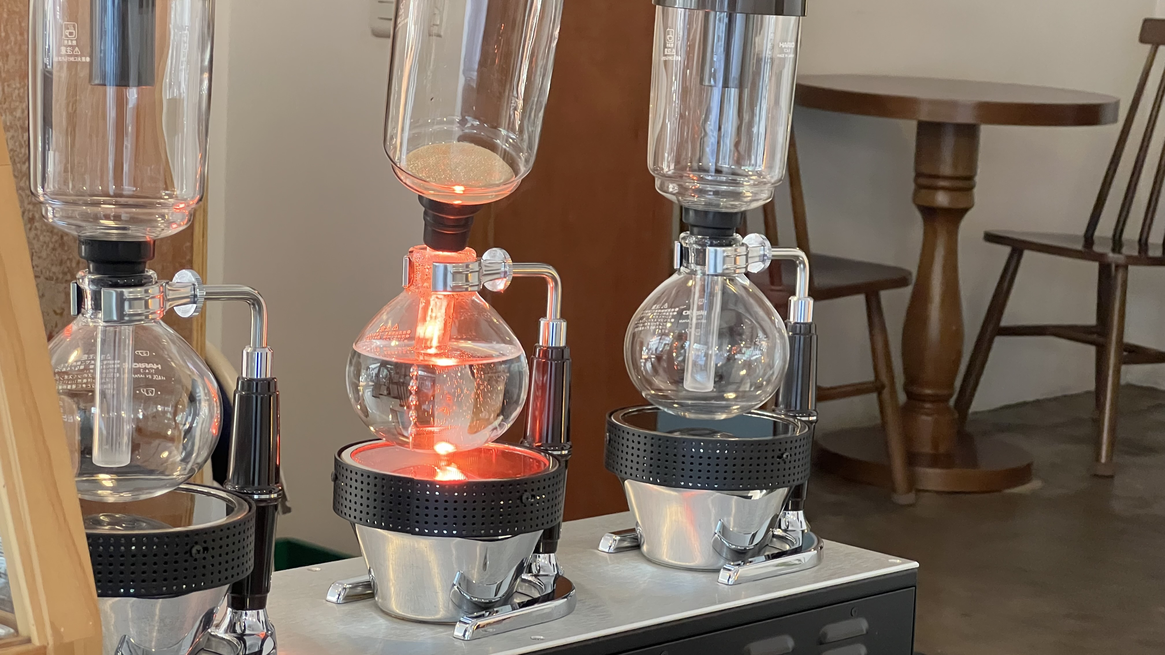 사진에서 보는것 처럼, 카운터의 오른편에 사이폰 커피 기구가 있습니다.