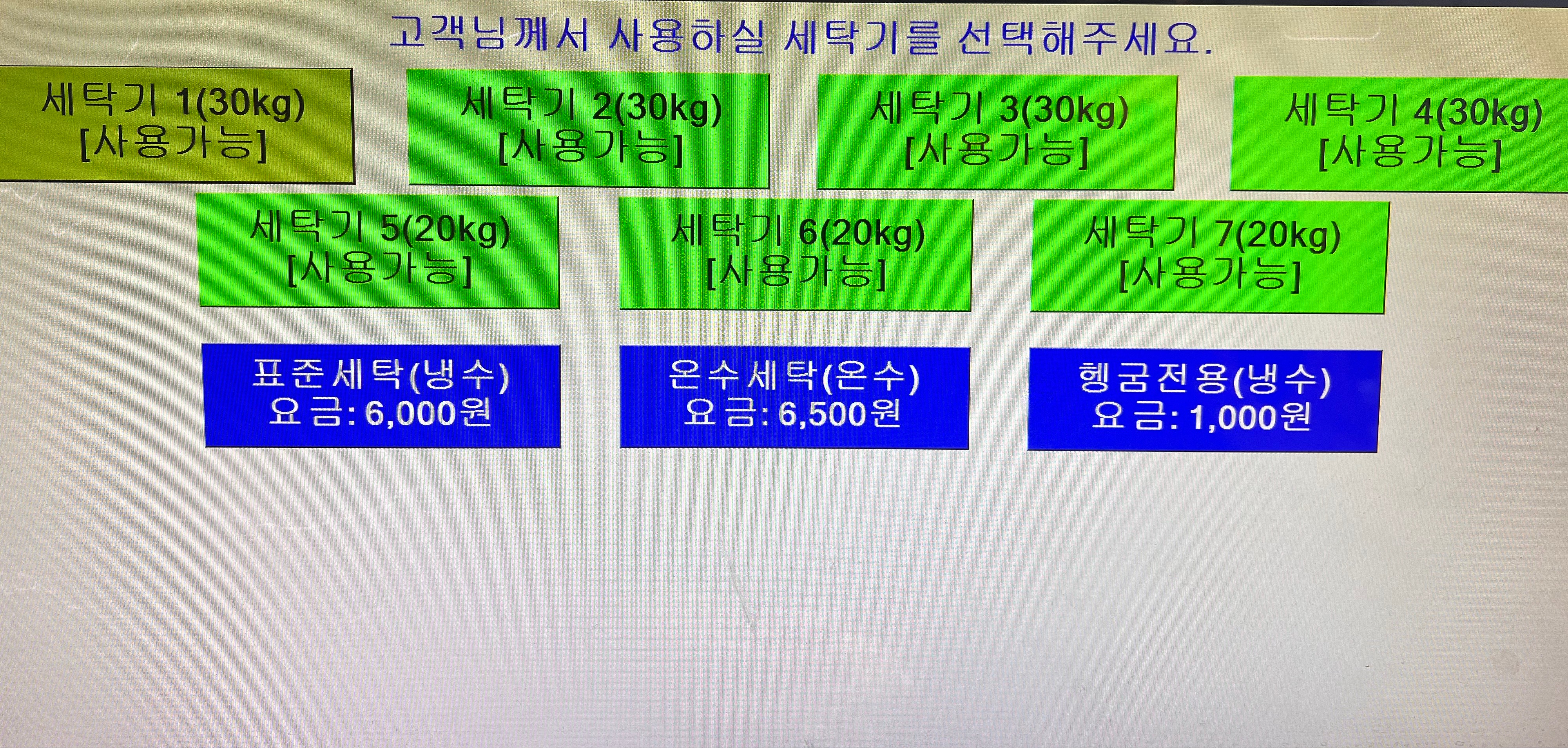 위의 사진에서 정면에 흰색의 사각형 모양의 건조기가 나란하게 있는 것이 보이시지요? 그중에 가장 왼쪽에 카드 구입 기기계와 동전교환기, 그리고 세제 자판기가 있습니다.