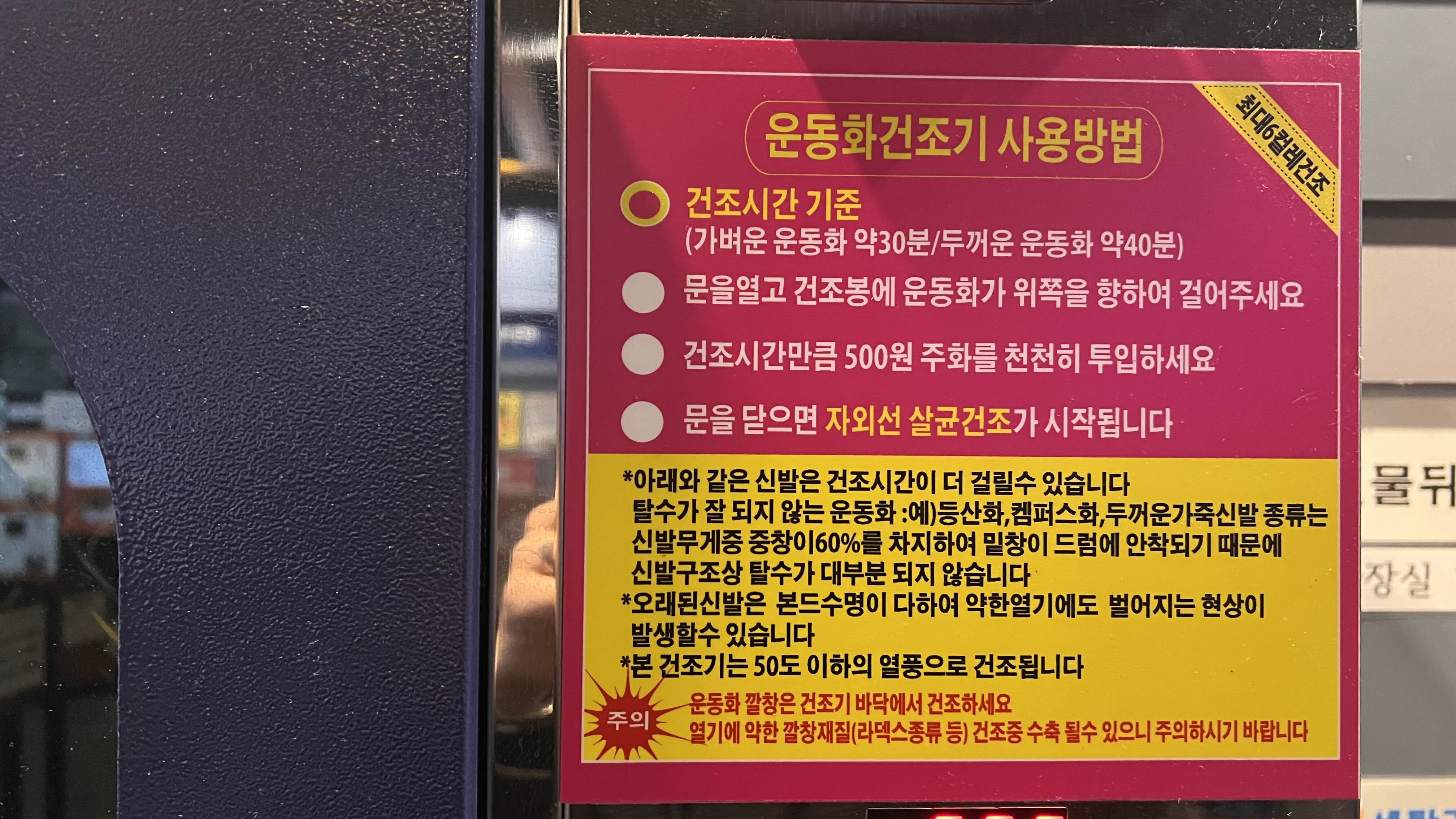세탁이 종료되면, 상단의 건조기에 운동화를 걸어서 다시 동전을 넣으면 되는데요, 운동화 건조기는 5백 원에 4분으로 4천 원이면 32분간 건조가 됩니다.