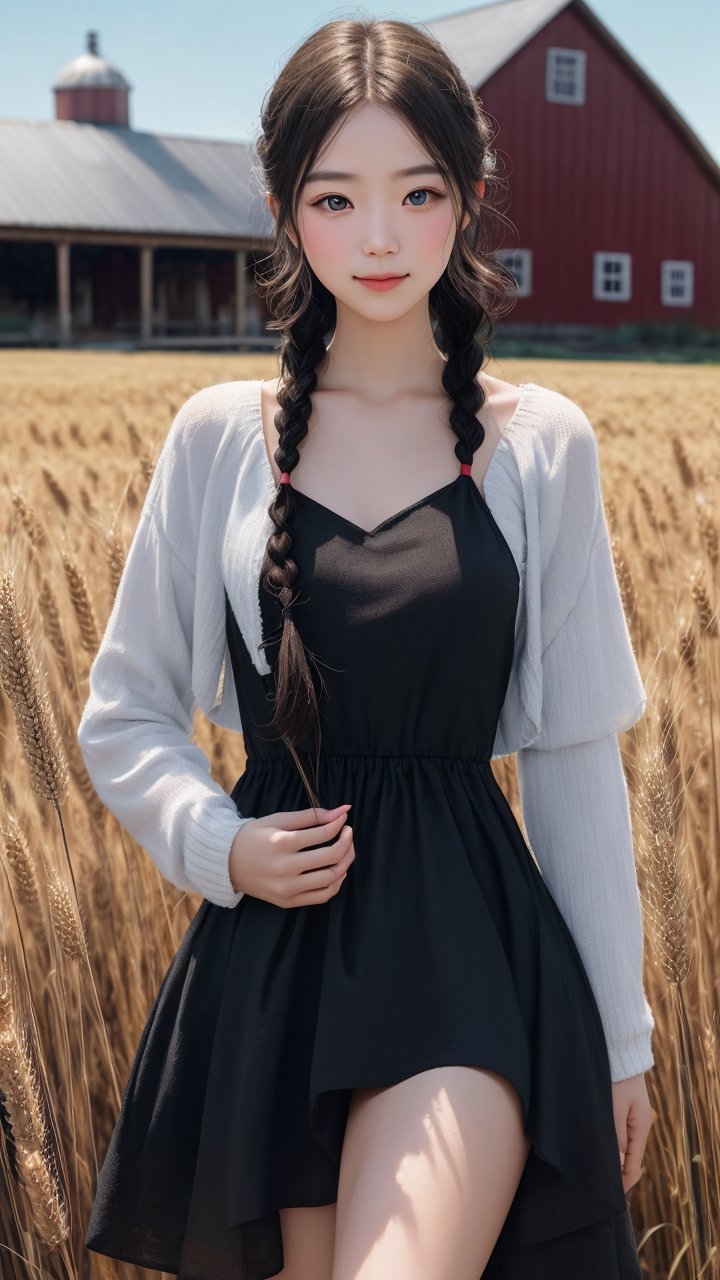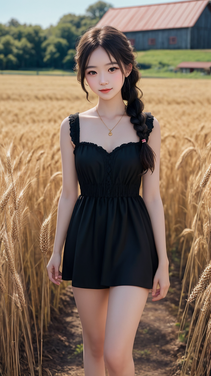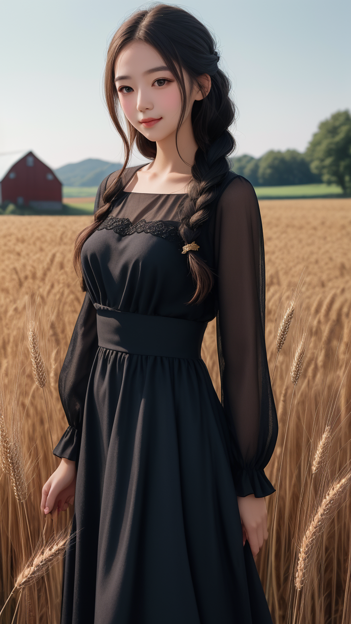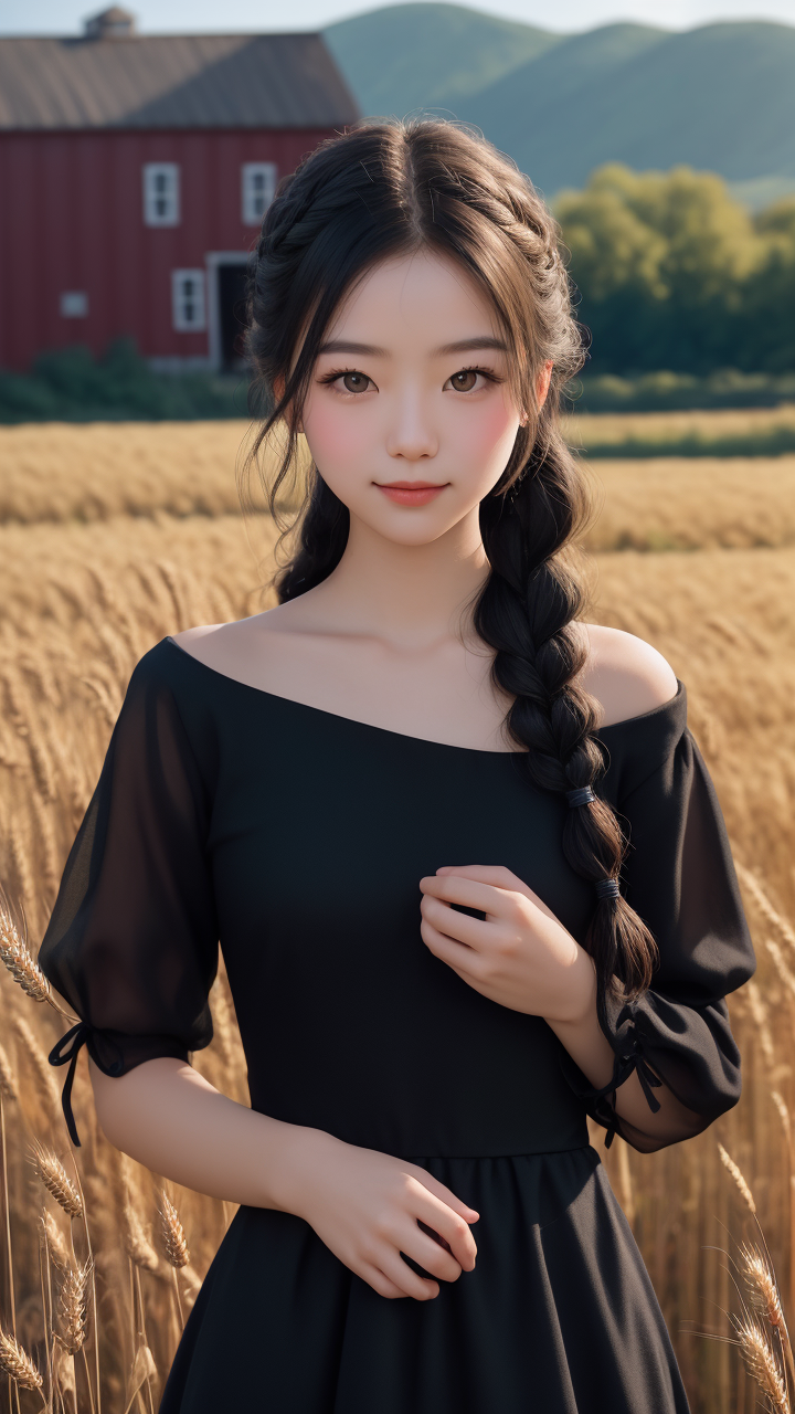 lora:FilmProvia2:0.6, 시골풍의 귀여운 검은 드레스에 땋은 머리를 하고 시골풍의 농장 환경에 서 있는 1명의 소녀. 그녀는 부드럽고 온화한 미소와 표정이 풍부한 눈을 가지고 있습니다. 배경에는 매력적인 헛간, 황금빛 밀밭, 맑고 푸른 하늘이 있습니다. 구성은 따뜻한 황금 시간대의 빛으로 목욕해야 하며, 부드러운 깊이의 들판과 부드러운 보케로 목가적인 고요함을 강조해야 합니다. 올드스쿨 35mm 필름에 촬영된 것처럼 이미지를 담아 매력을 더해줍니다. 영화 초상화 사진