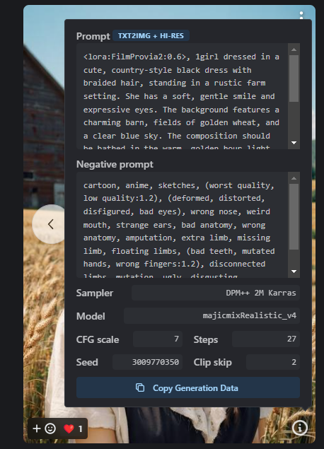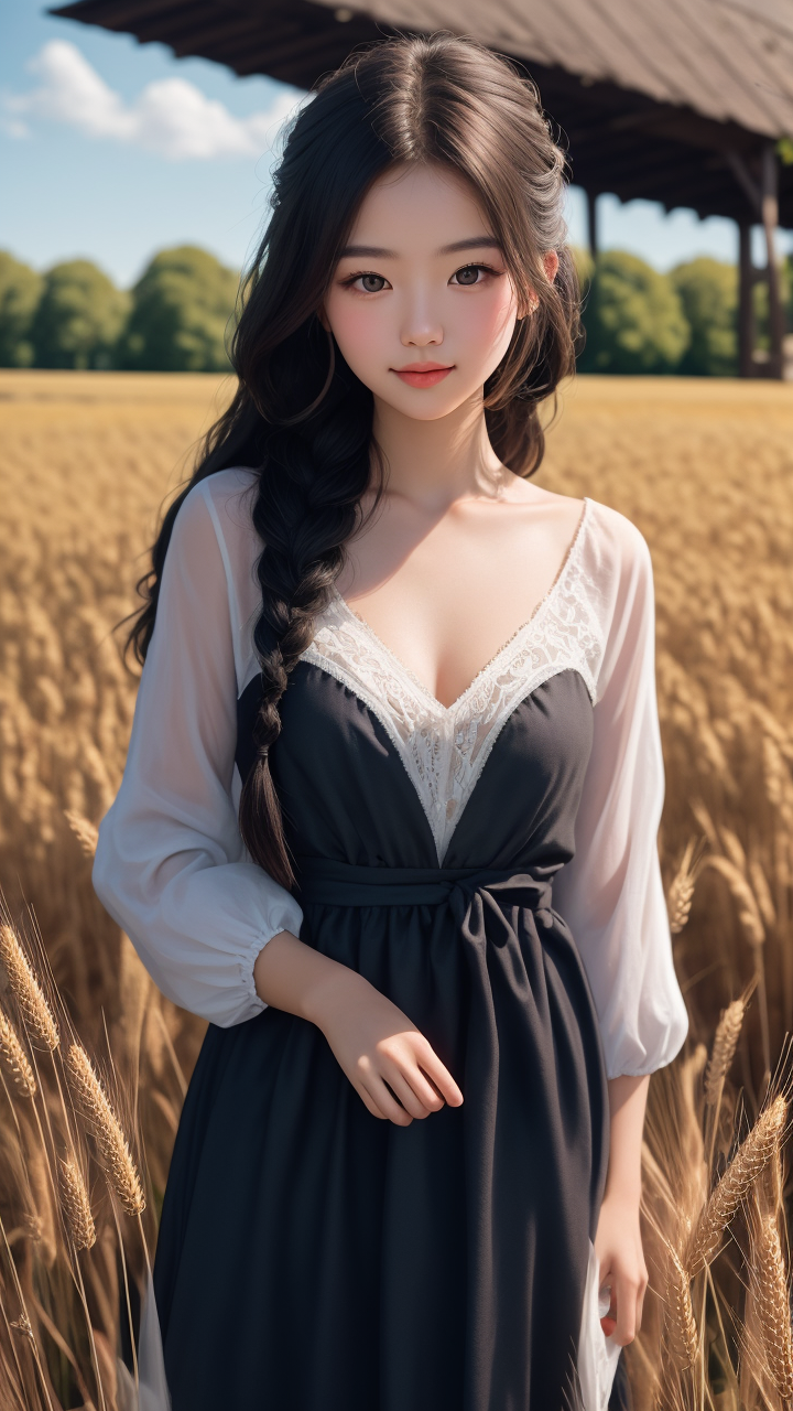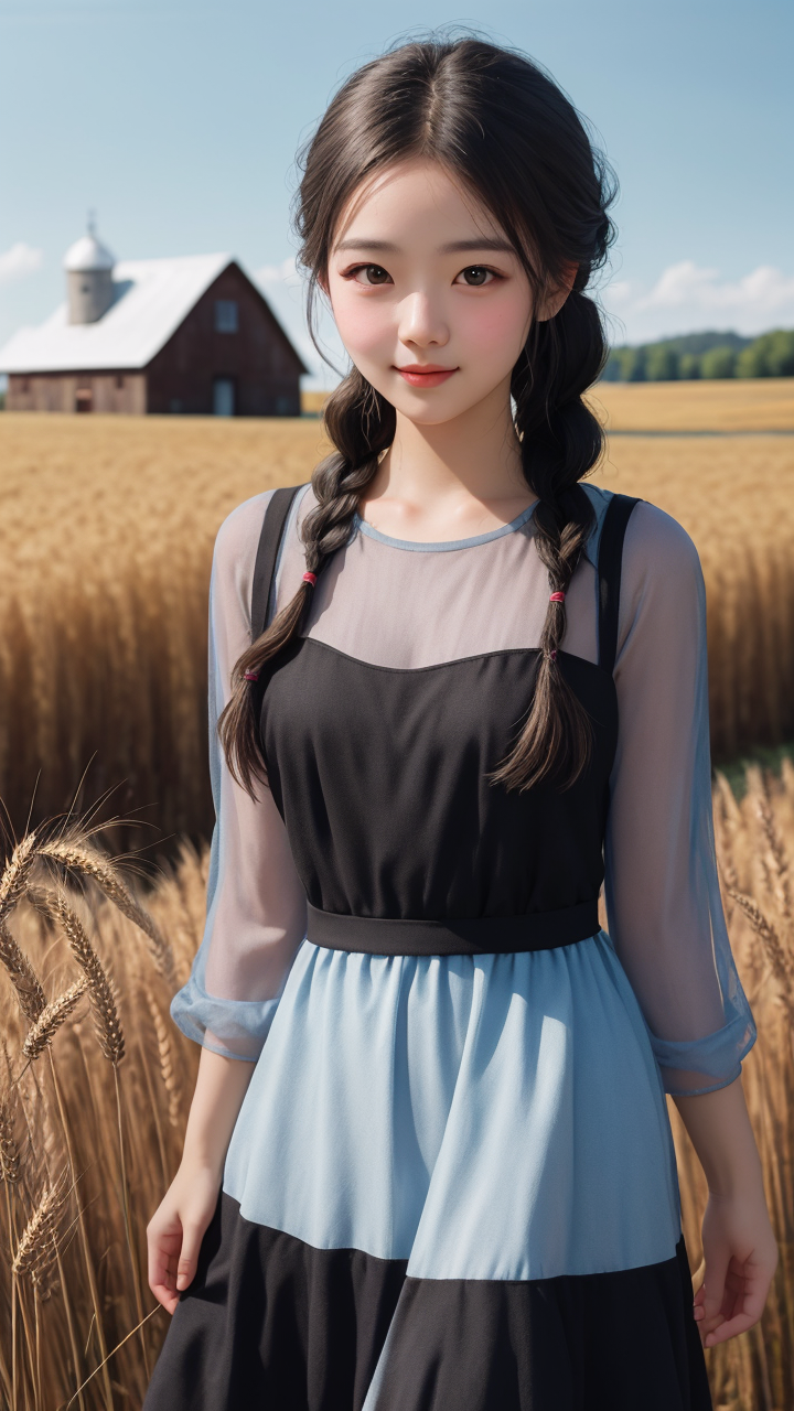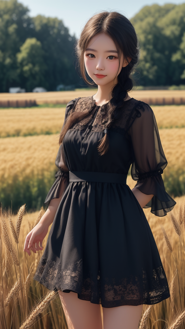 lora:FilmProvia2:0.6, 시골풍의 귀여운 검은 드레스에 땋은 머리를 하고 시골풍의 농장 환경에 서 있는 1명의 소녀. 그녀는 부드럽고 온화한 미소와 표정이 풍부한 눈을 가지고 있습니다. 배경에는 매력적인 헛간, 황금빛 밀밭, 맑고 푸른 하늘이 있습니다. 구성은 따뜻한 황금 시간대의 빛으로 목욕해야 하며, 부드러운 깊이의 들판과 부드러운 보케로 목가적인 고요함을 강조해야 합니다. 올드스쿨 35mm 필름에 촬영된 것처럼 이미지를 담아 매력을 더해줍니다. 영화 초상화 사진