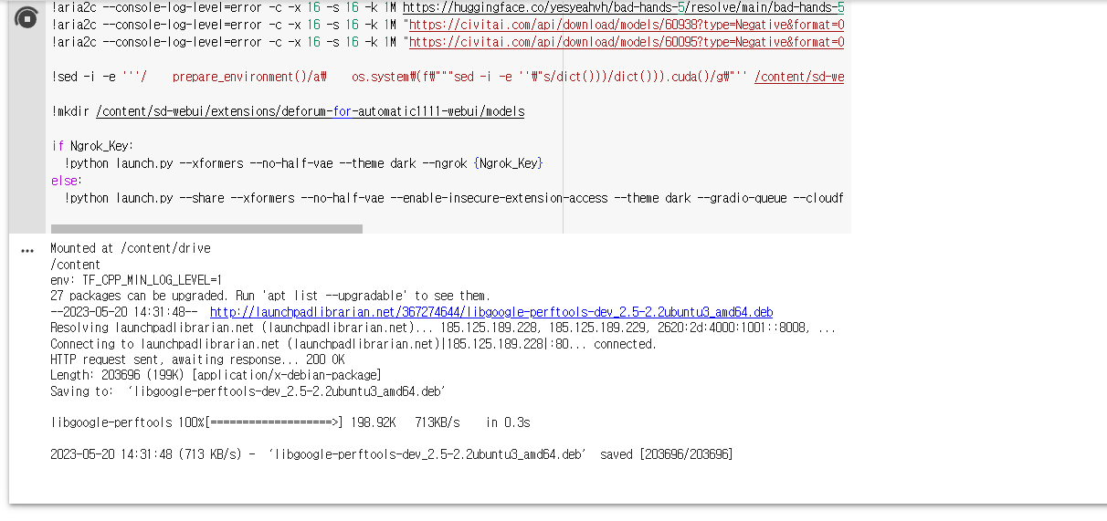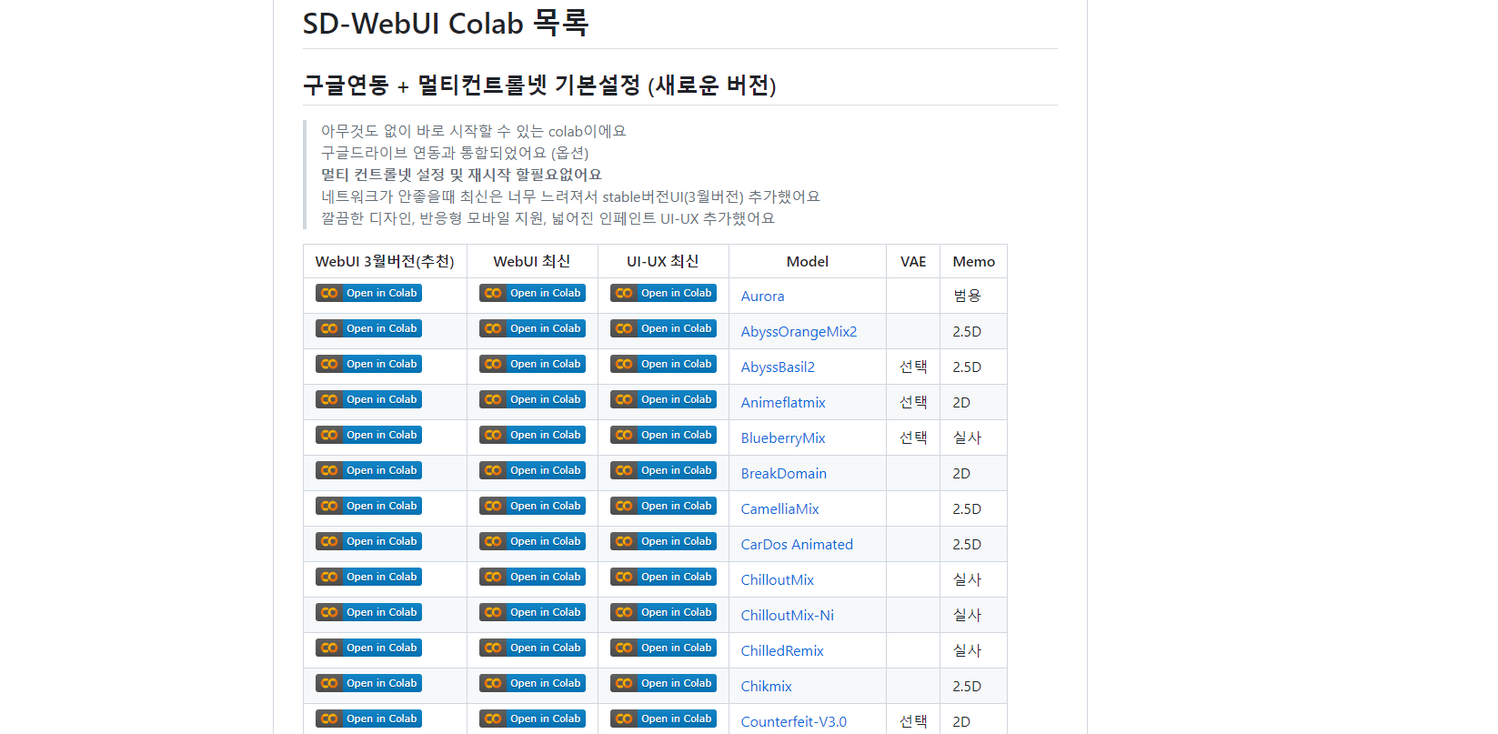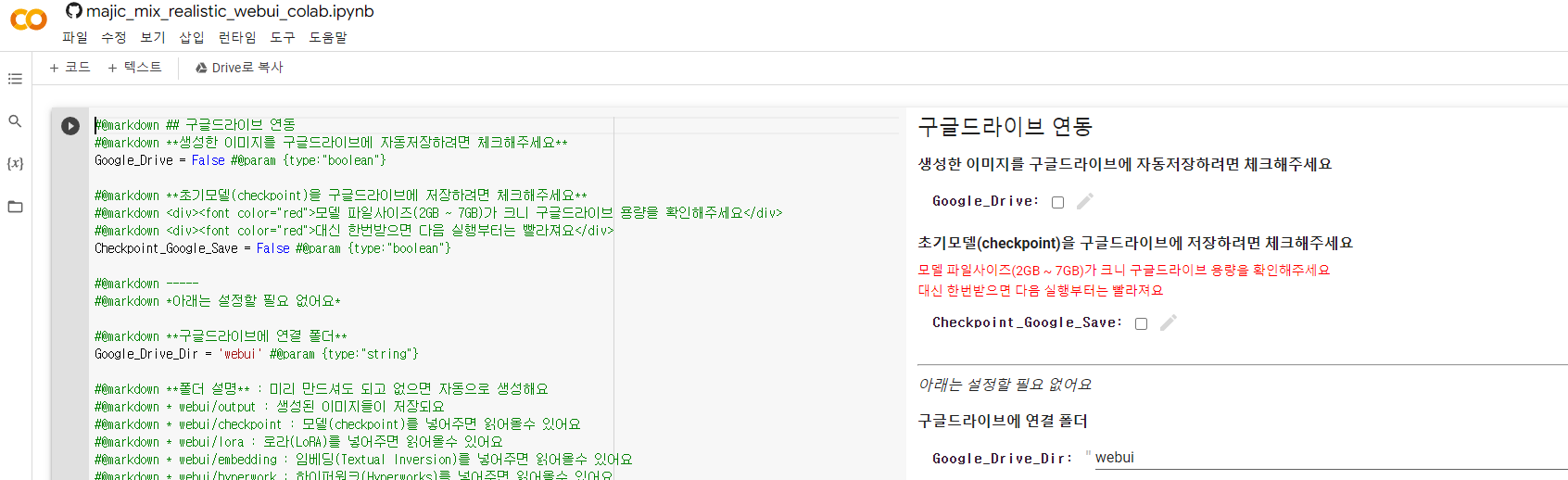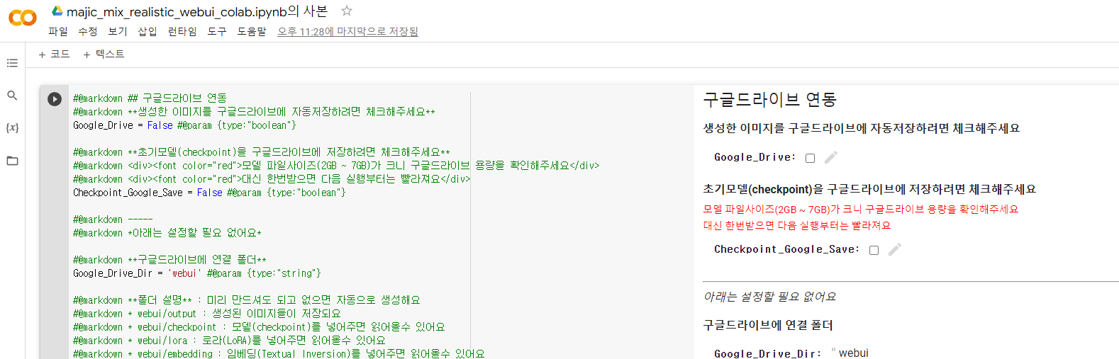 아참, 오늘 포스팅 내용을 활용하시면 스테이블 디퓨전의 구글 드라이브 설치 오류와 런타임오류(?) 그리고 모델 설치등의 번거로움이 많이 해결되리라 생각됩니다.