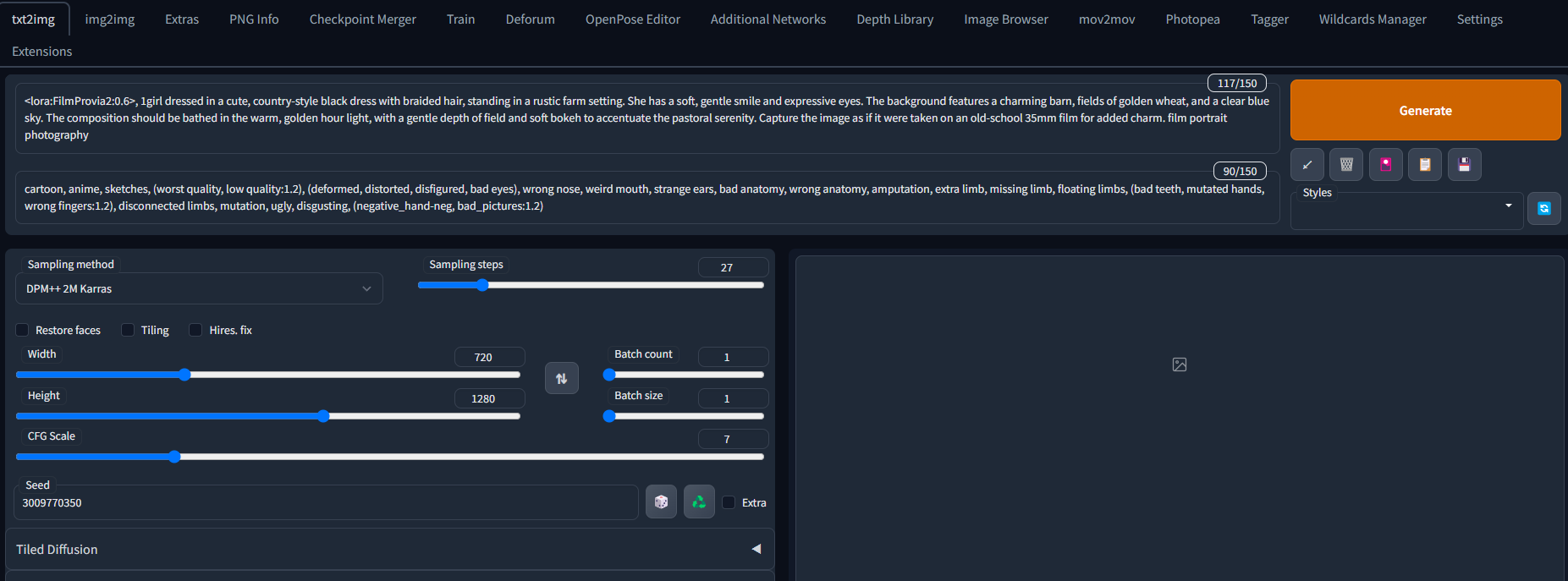 그리고 위에 기록된 프롬프트를 비롯해서 여러 설정값을 스테이블 디퓨전에 옮겨 넣기 하면 됩니다.