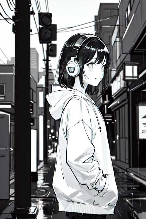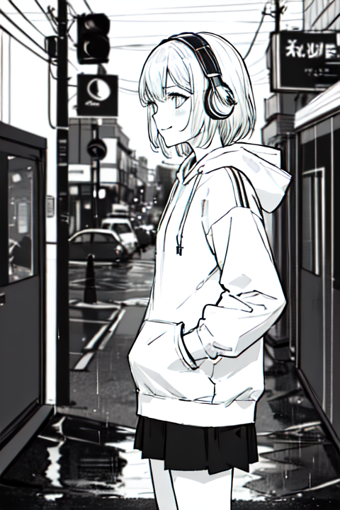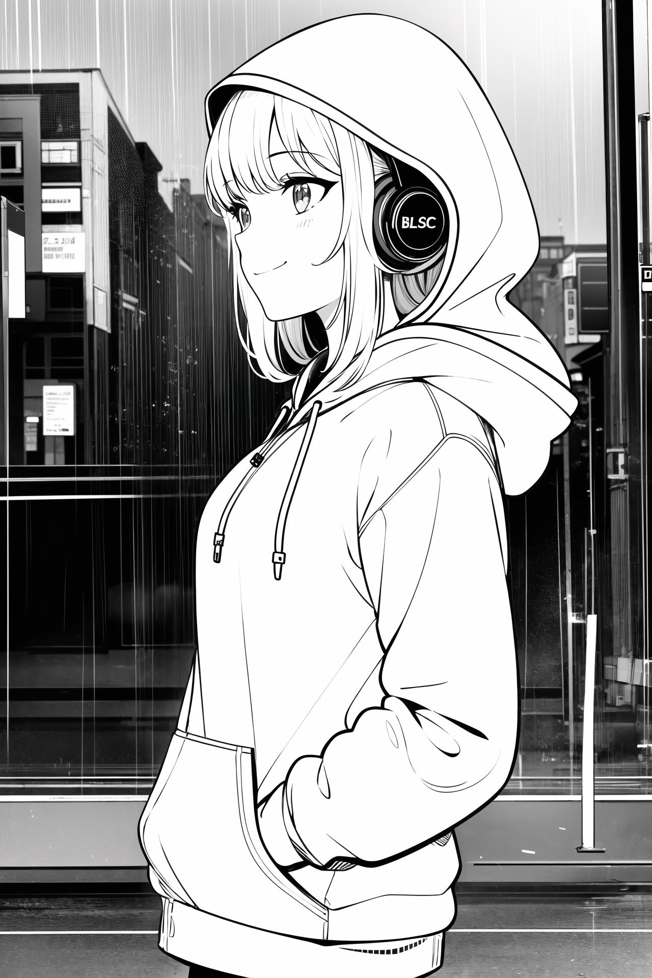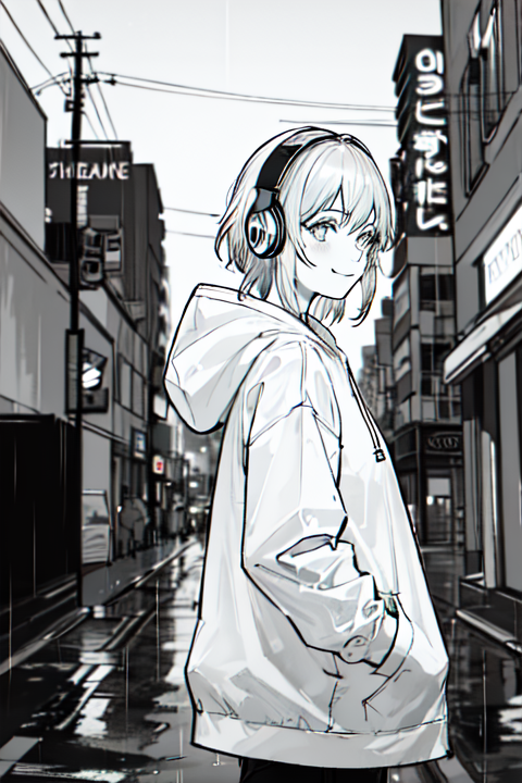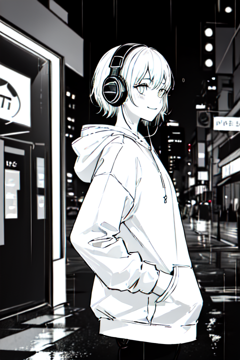 hoodie,headphones, street,outdoors,rain,neon lights, light smile, hood up, hands in pockets,