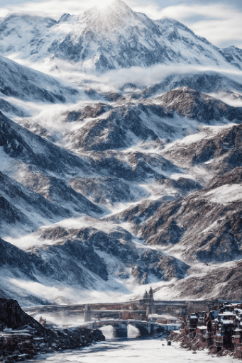 black_border, building, city, day, fantasy, ice, landscape, letterboxed, mountain,