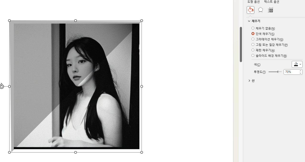 이미지를 그리고 단색으로 채우는데 저는 검정색으로 채우기를 했으며 투명도는 70%로 잡았습니다. (테두리는 없이 했습니다.)