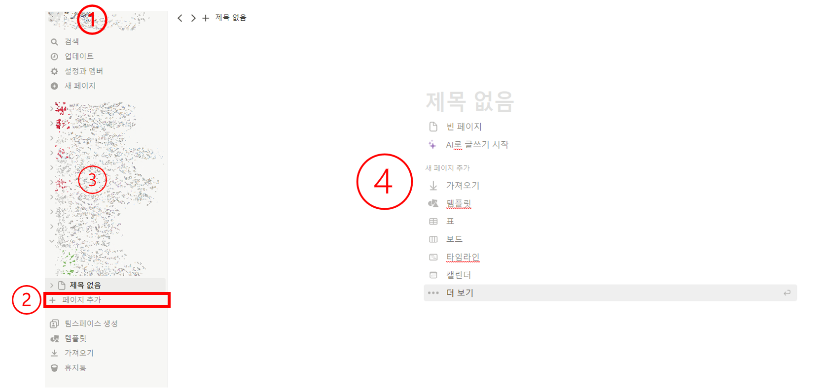 그리고, 2번에서 페이지 추가를 활용해서 작성할 페이지를 만들면 되는데, 4번이 우리가 작성하게 되는 페이지라고 생각하시면 되겠습니다.