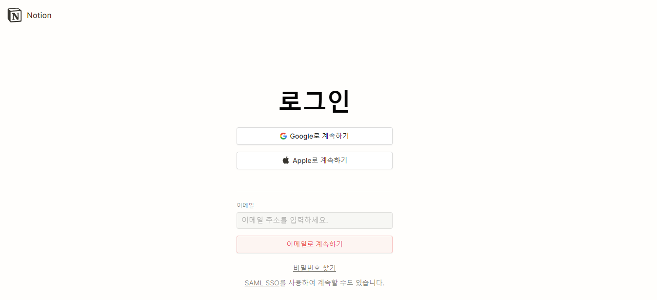 때문에 노션 어플리케이션 설치 후 위의 이미지와 같이 로그인 화면이 나오면 구글, 애플등의 버튼이 아니라 아래에 나와있는 이메일에 주소를 입력하셔야 합니다. 그리고 이메일로 계속하기를 클릭하시면 되지요.
