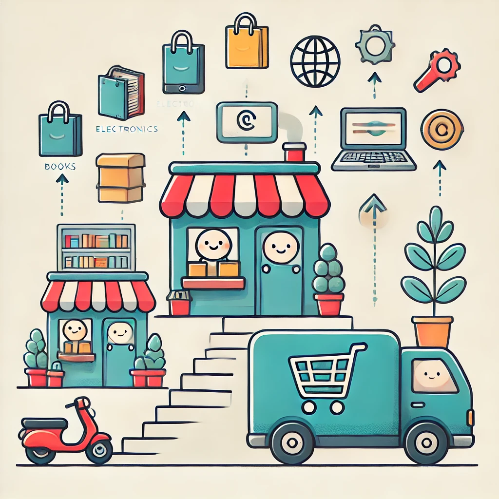 책을 판매하는 온라인 서점으로 시작한 아마존은 이후 CD, 전자제품, 의류 등 다양한 제품을 판매하며 확장되었다. 베조스는 "모든 것을 판매하는 가게(The Everything Store)"를 목표로 삼고, 플랫폼을 성장시켜 나갔다.